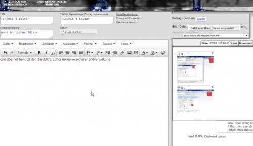 rund um den Editor wurde eine eigene Bild / Download und Linkverwaltung, sowie automatisches Speichern alter Versionen implementiert: siehe TinyMCE 4 Editor