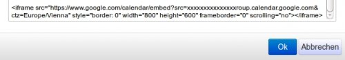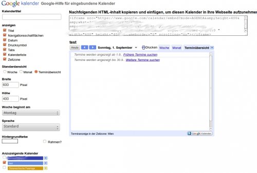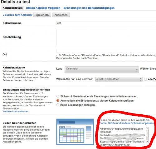 unter Kalenderdetails sehen wir bereits den HTML-Code für die Einbettung auf der Webseite: