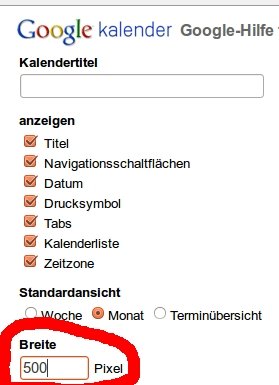 Die Breite sollte ev. kleiner gewählt werden, damit der Kalender auf der Homepage Platz hat: